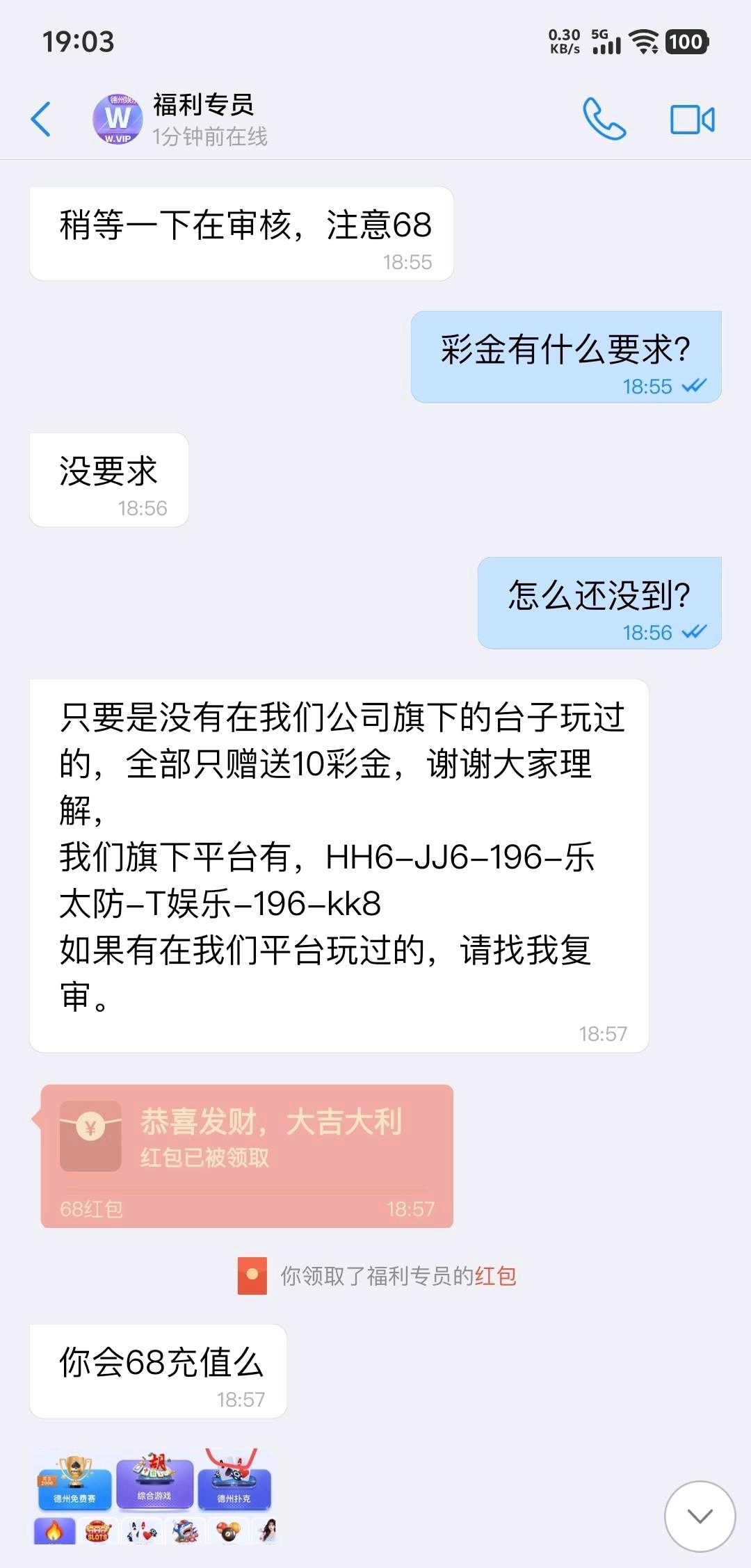 下载了之后点击我的点击上级,然后下载68加那个专员就行,他会在68聊天软件发红包给你,你可以充到游戏里
