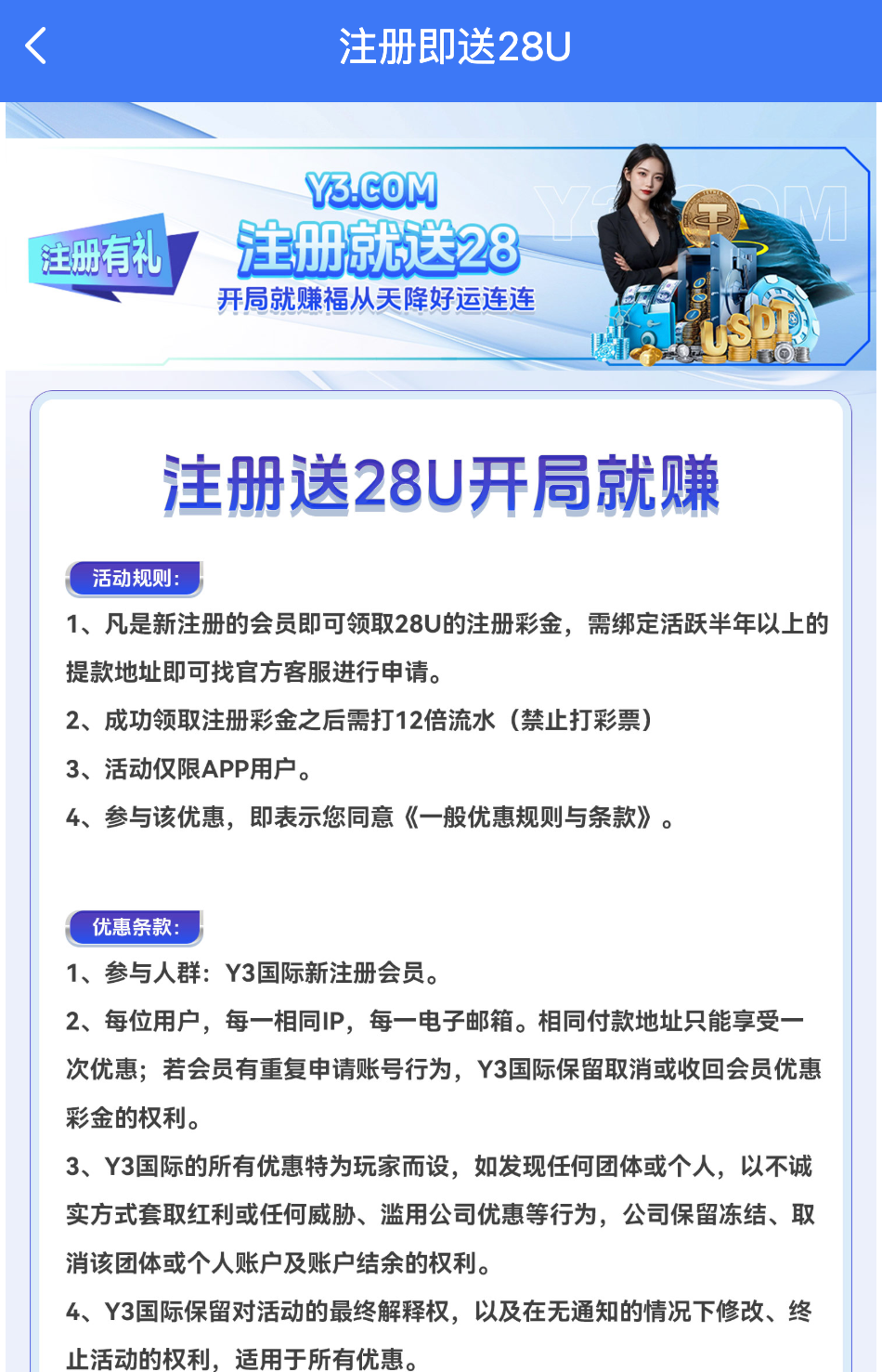 【Y3国际】注册送28U