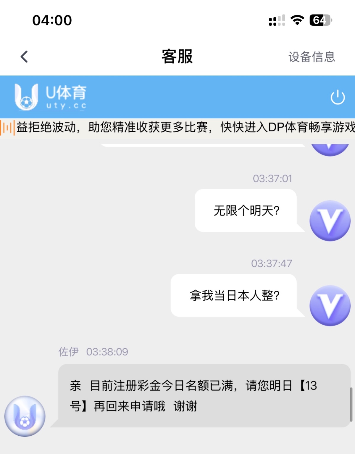 aa8567 我00:00去申请 客服说帮我提交申请了 今天去给我说名额满叫我明天再来 无限个明天