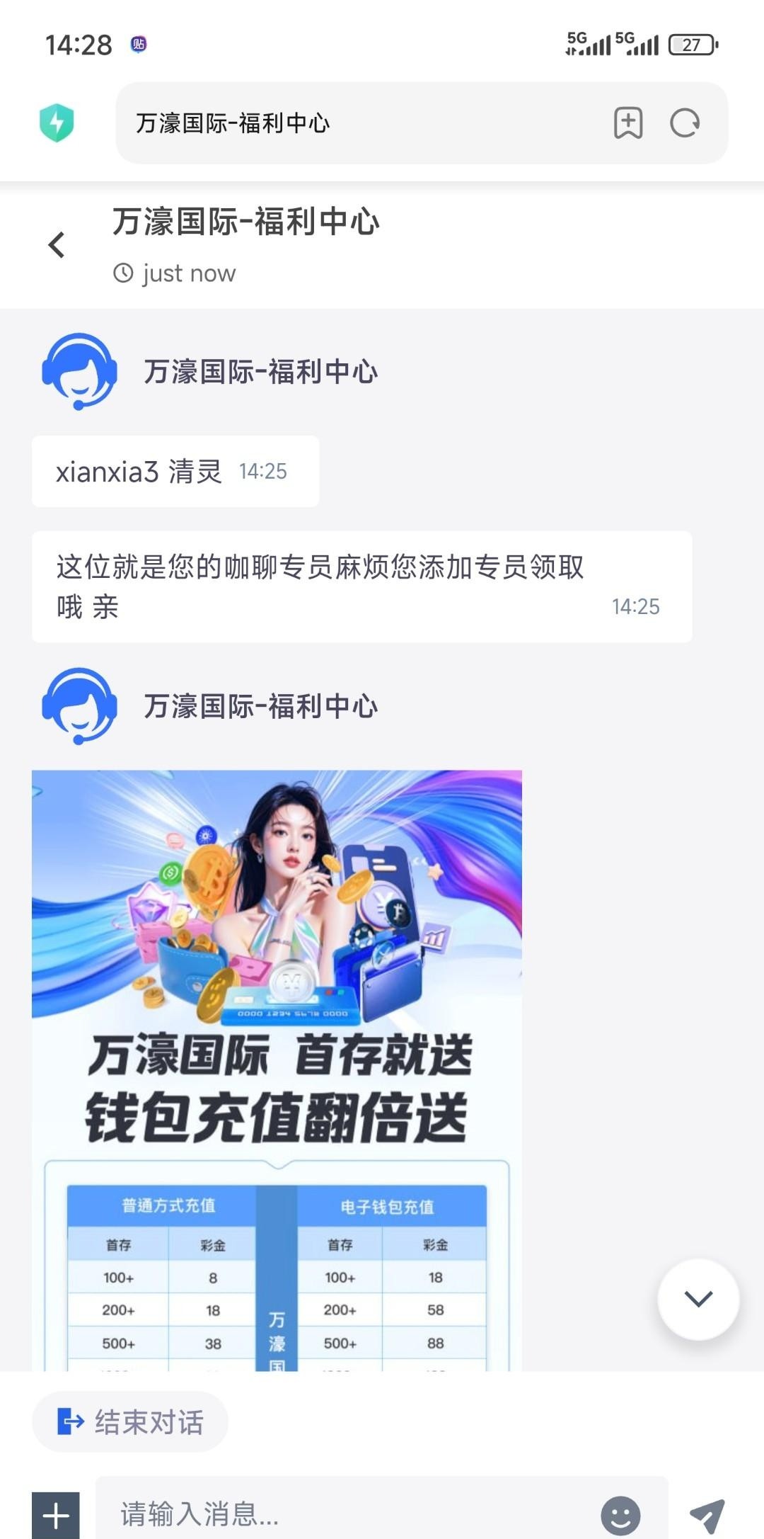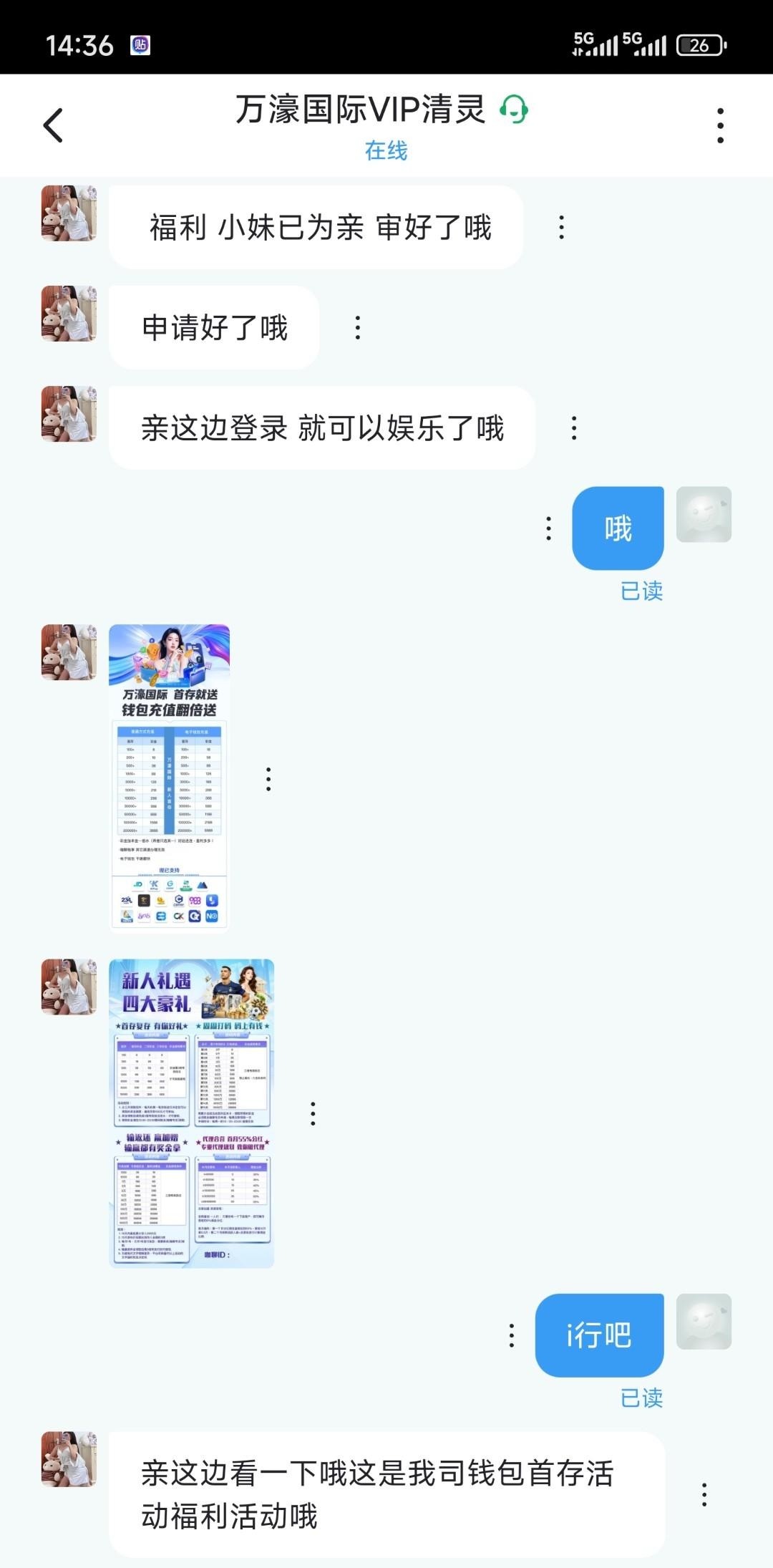 送88电话链接5550017.com联系客服,说领取电话体验金把手机号发她,然后注册一个账号,邀请码填写他给的就行,然后让你下载聊天app去领取彩金,不要充值,白嫖就好,黑了别他妈逼逼!