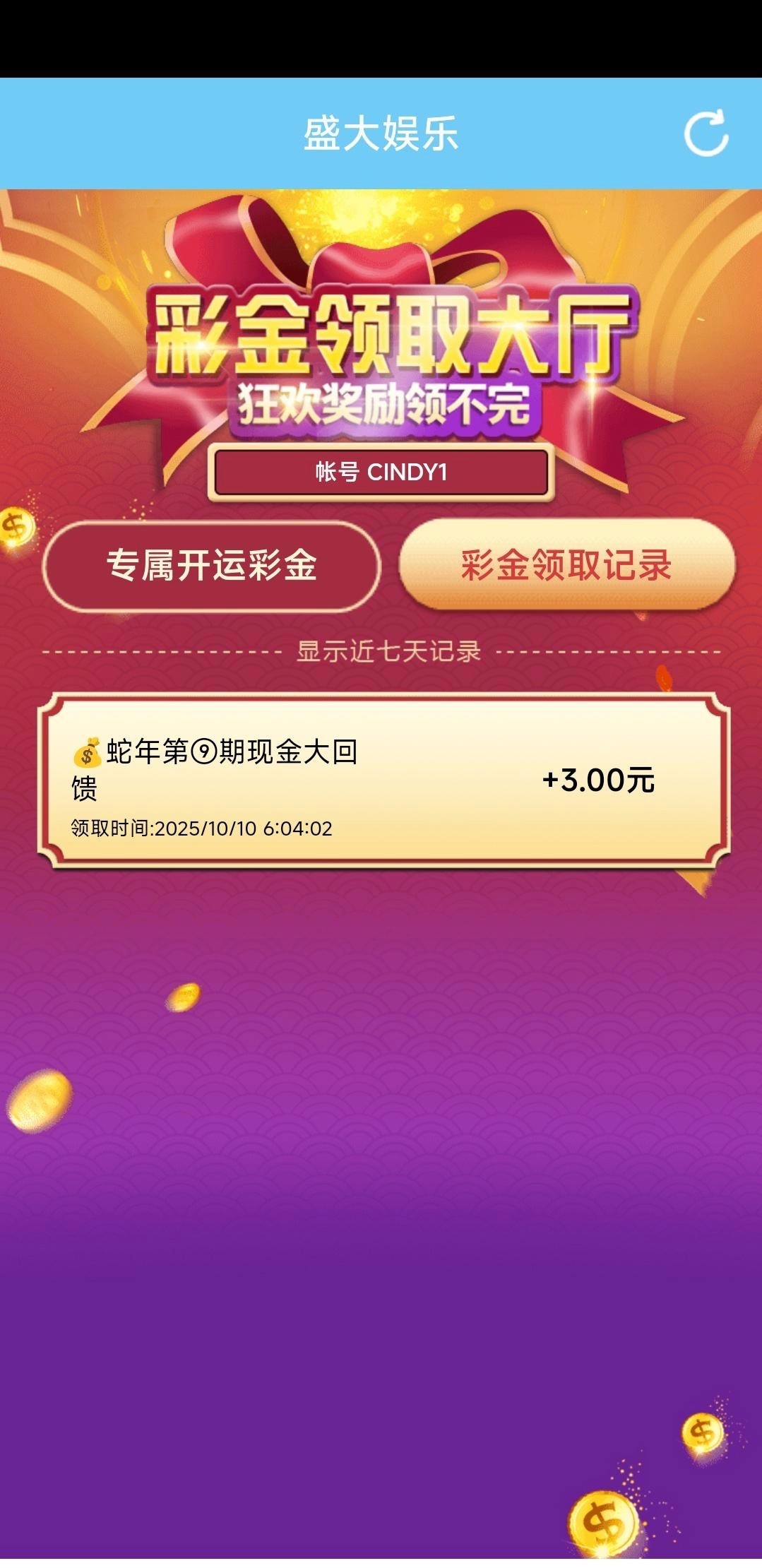 盛大点彩金大厅专属彩金回馈我回馈了3元都去看看