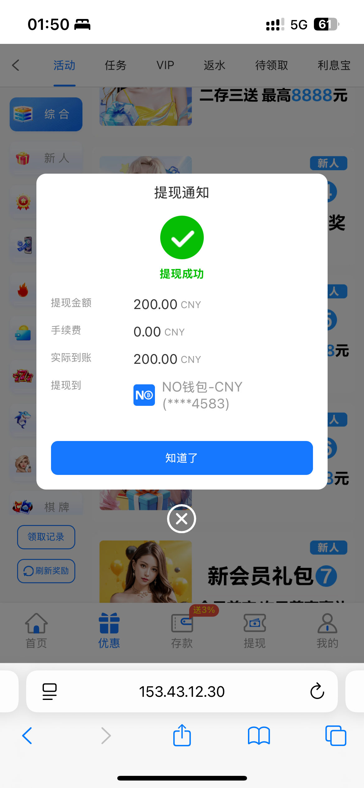 注册验证短信就自动送5了,100提 赌神去就好了
