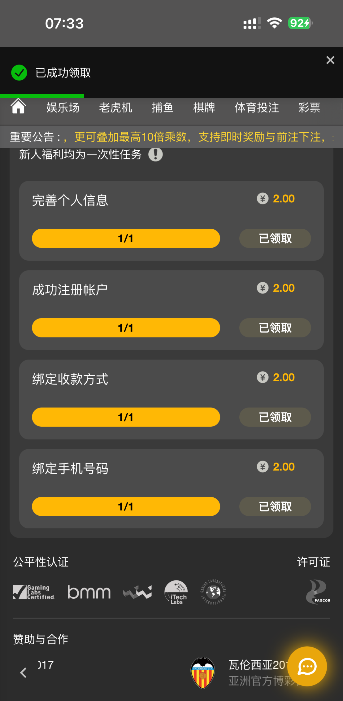 领到十块 打鱼打到70挂了
