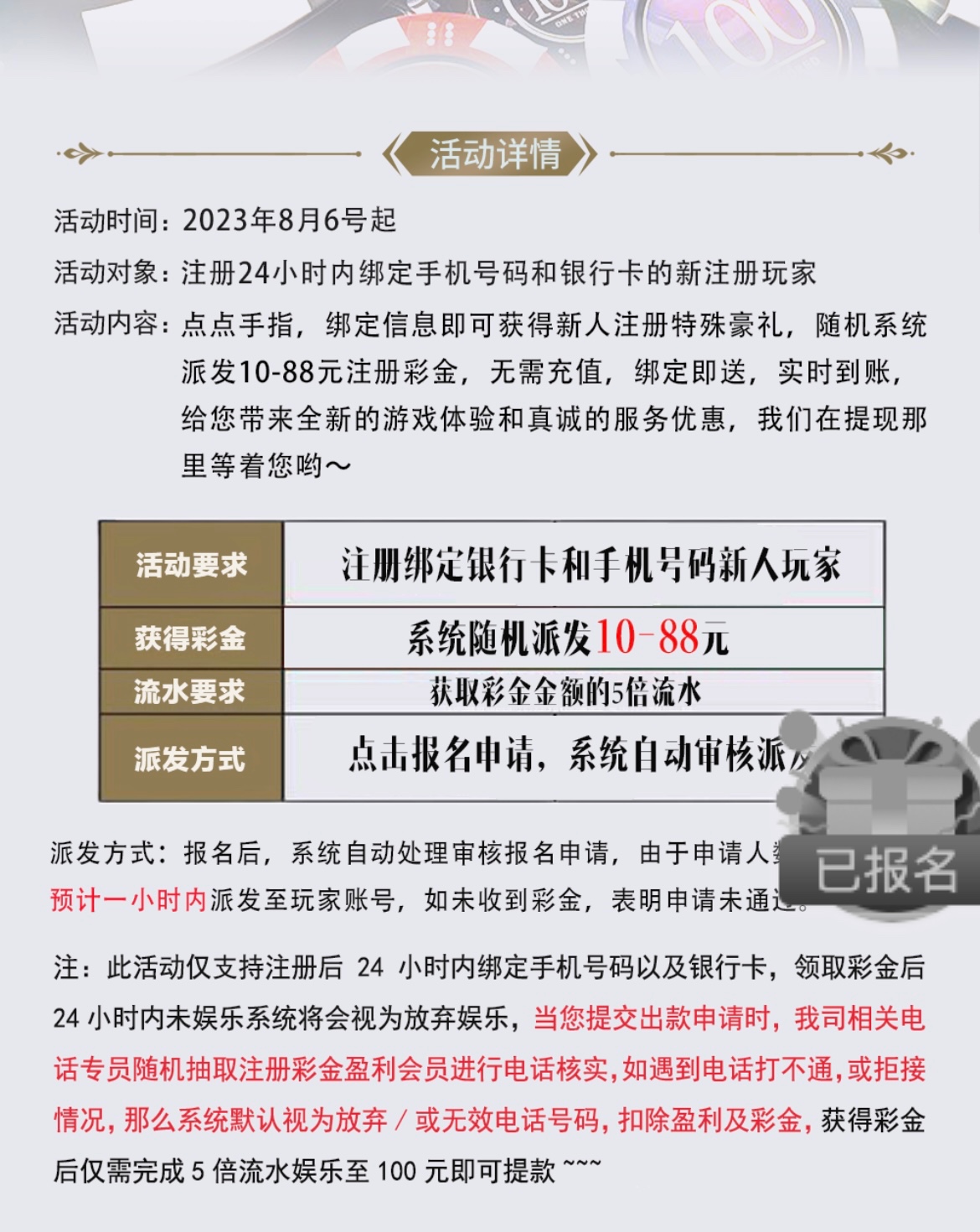 注册绑卡优惠里自助领取彩金,五倍水,满100提。